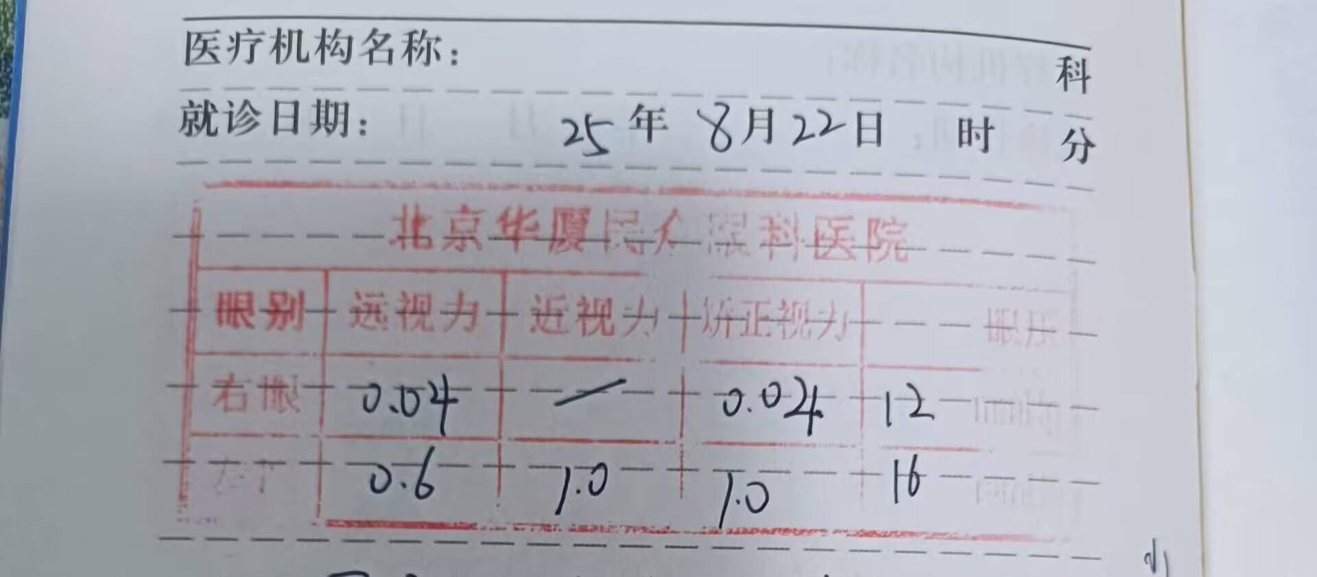 家长提供了孩子受伤前的眼健康档案。档案显示,孩子此前双眼视力均为1.0。今年5月,孩子在北京接受治疗时,右眼远视力检测结果为“光感”;今年8月22日复查时,孩子右眼远视力检测结果为“0.04”。